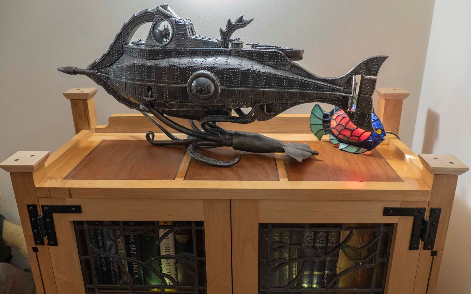 The Nautilus is largely made of old wrought iron scavenged from an ancient quarry, where old railway lines of the pre-steam era (horse-drawn) still lie about for blacksmiths to play with. The maker enjoys making things of a gothic nature.