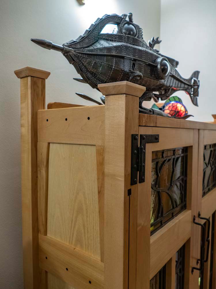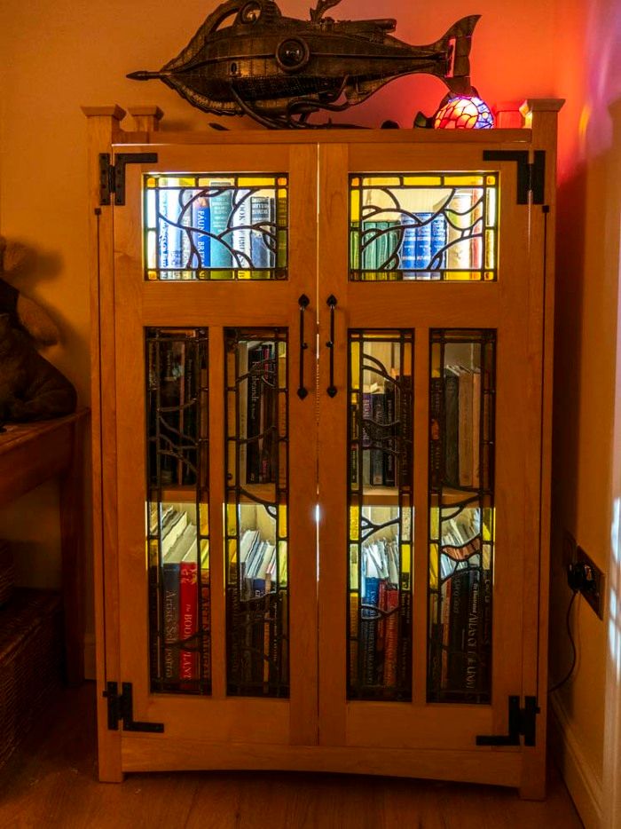 The black iron work is by a local small maker who creates all sorts of black iron stuff, including hardware like that shown here but also more sculptural pieces. The stained glass panels are also by a local maker who works alone in the hinterlands of West Wales, in the Cothi valley.