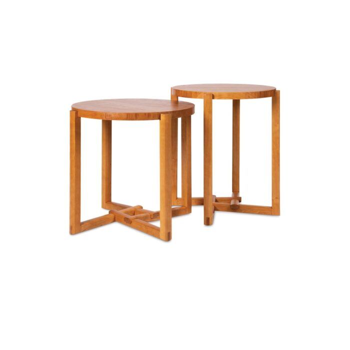 These modern nesting side tables are built using offcuts from the Austin School of Furniture. Austin joined strips of cherry to form circular tops in two different sizes. The legs are joined to the feet with an angled bridle joint. Each foot lifts upward at a subtle 3° and intersects the other feet as a focal point below the top.