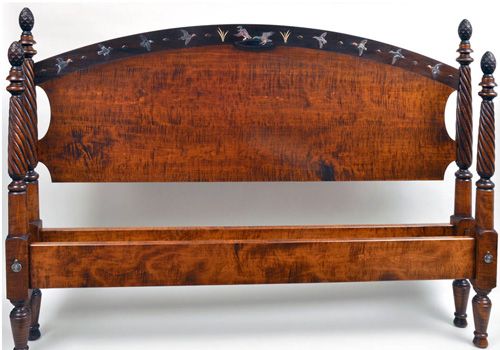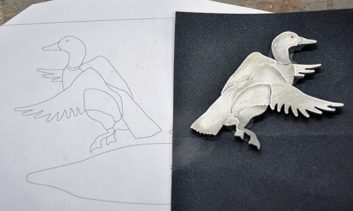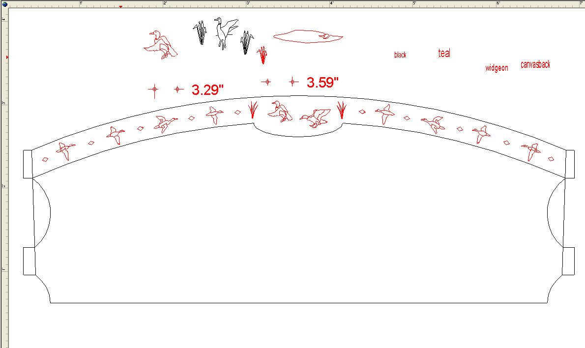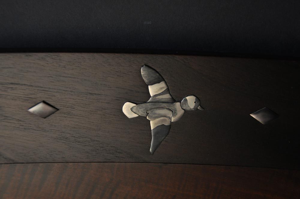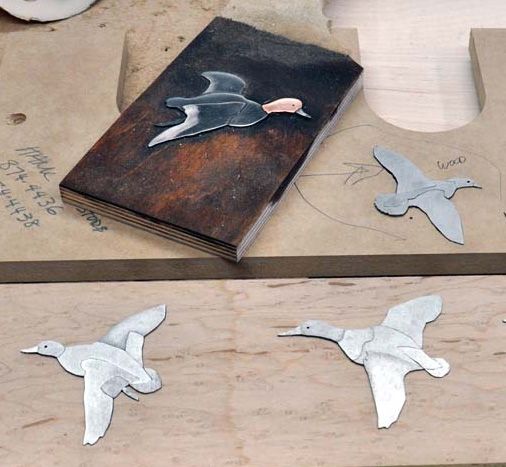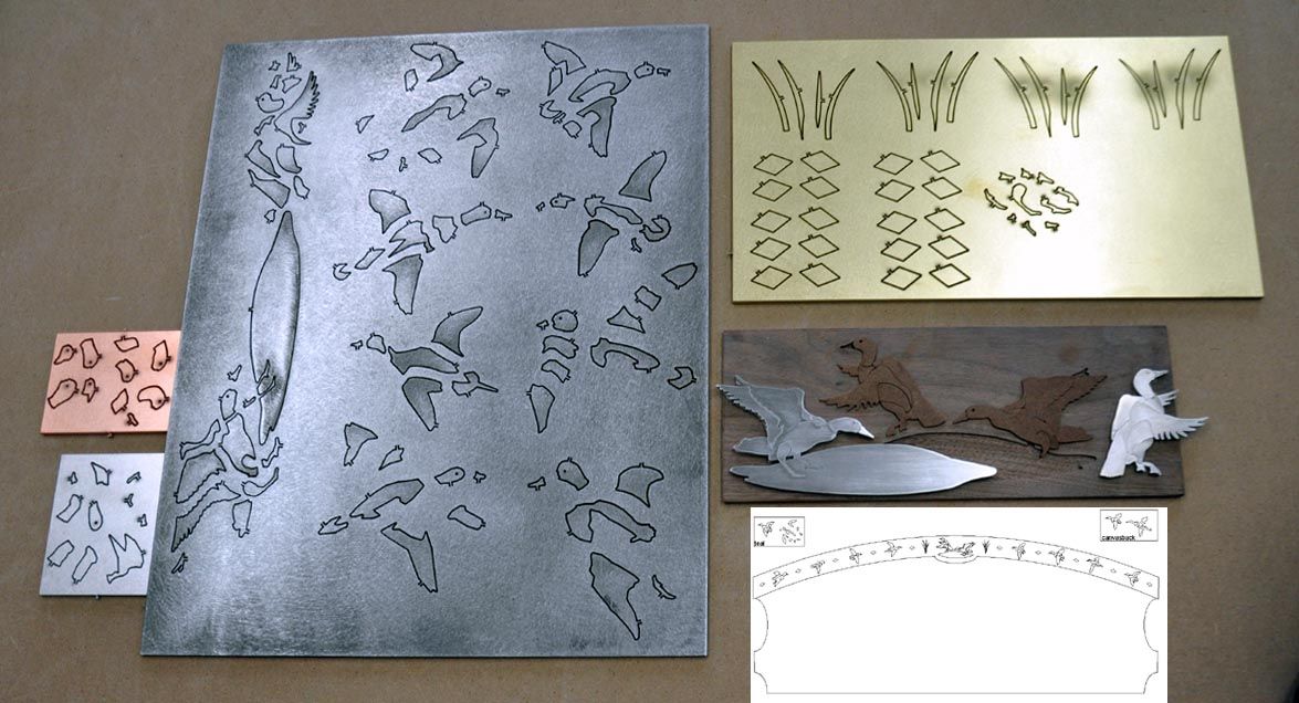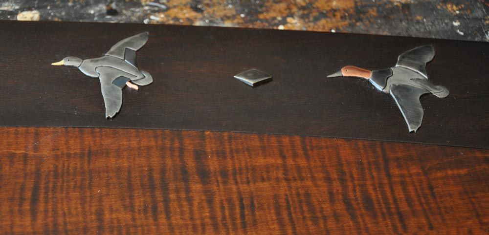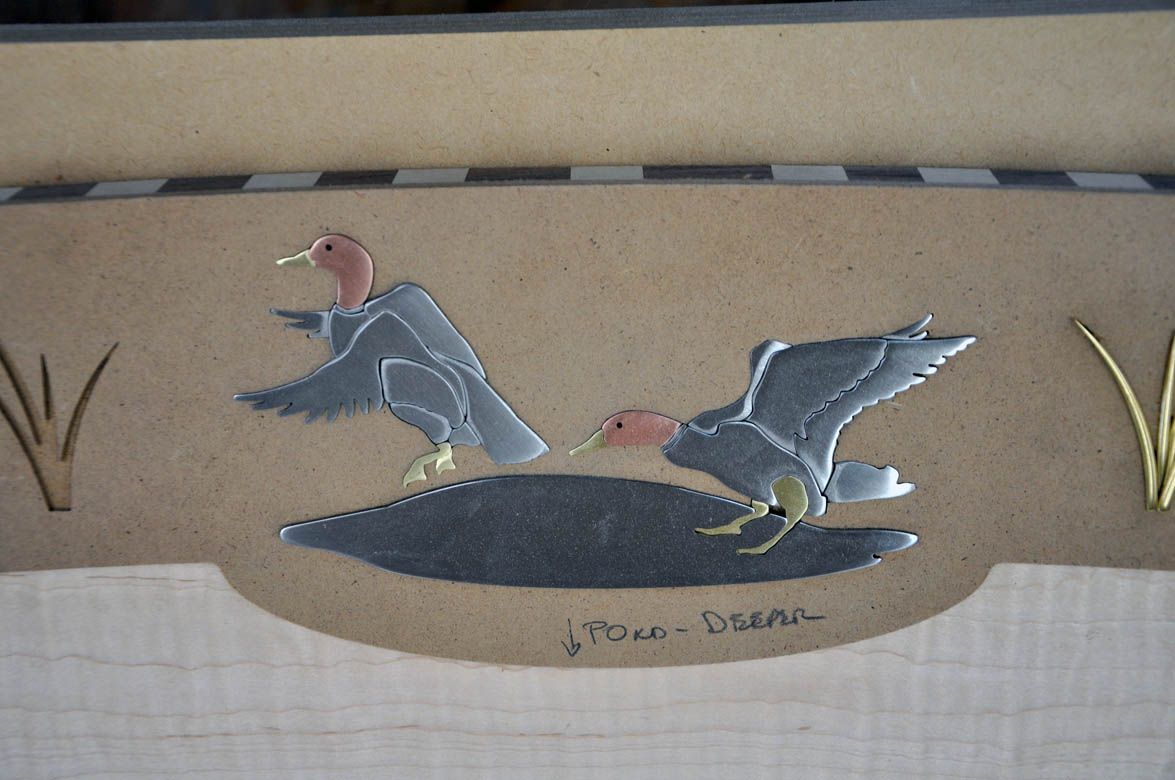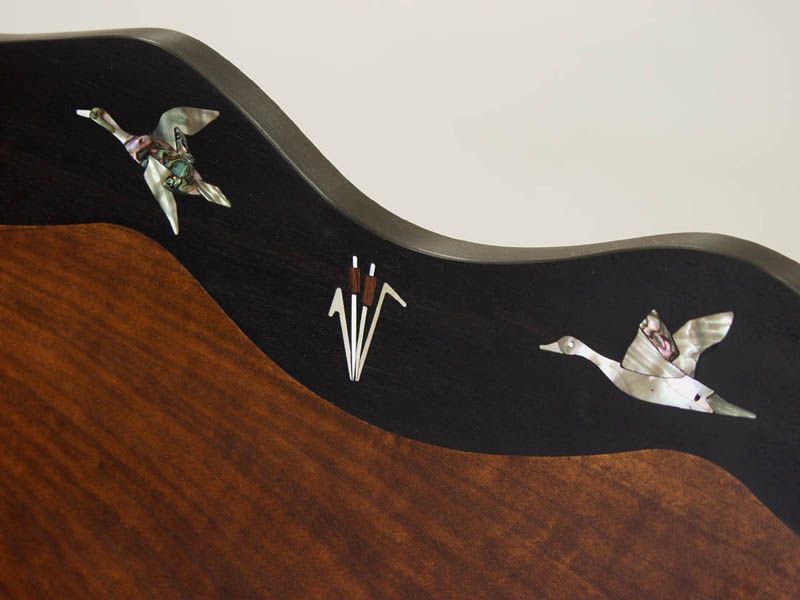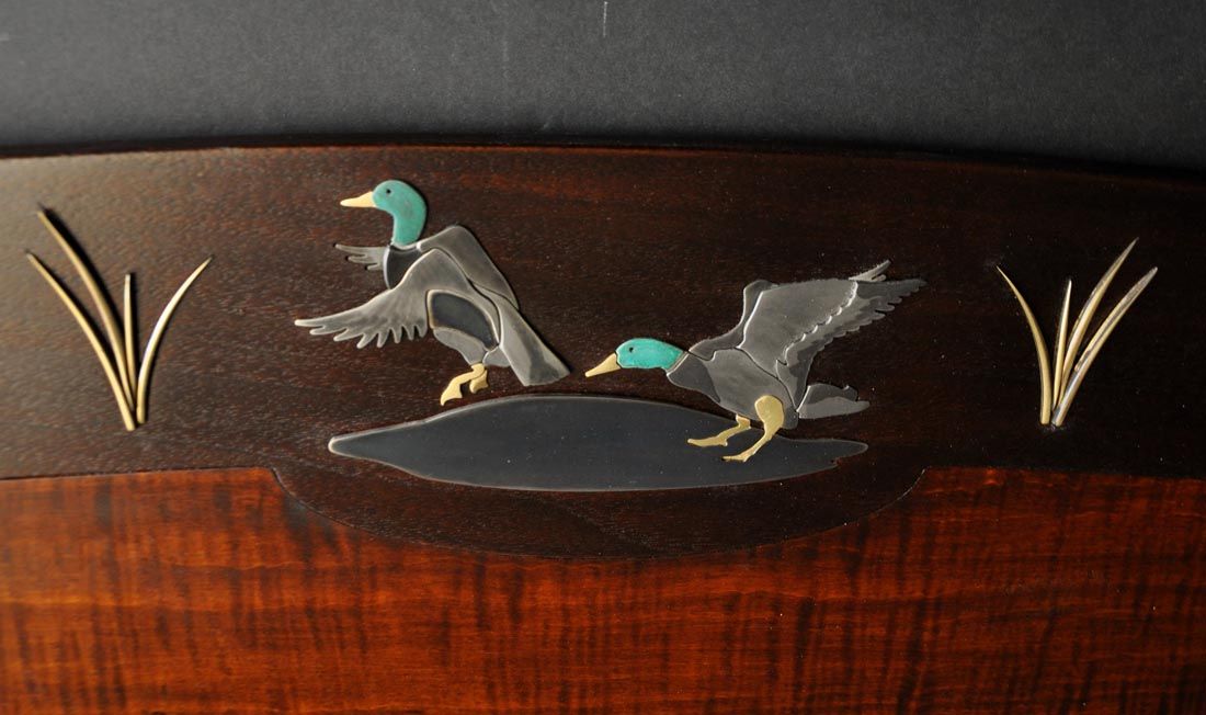 Back in the mid 1990’s, I was commissioned to build a bed for a client that included abstract abalone inlays of stylized birds and leaves. Over the next ten years, we did other versions of the abolone inlaid headboards, including one in 2005 for a client in Tennessee featuring ducks. All those designs featured flush sanded inlays of various motifs including bears, deer, snowflakes, pine cones and other geometric images. When one of my longtime clients requested a new king size bed featuring the ducks, we decided that the inlays should reflect the gold inlay work that you often see on fine shotgun receivers. It was a stretch, but the process was similar. We just had to have someone with a water jet cut the inlay parts from our CAD drawings.