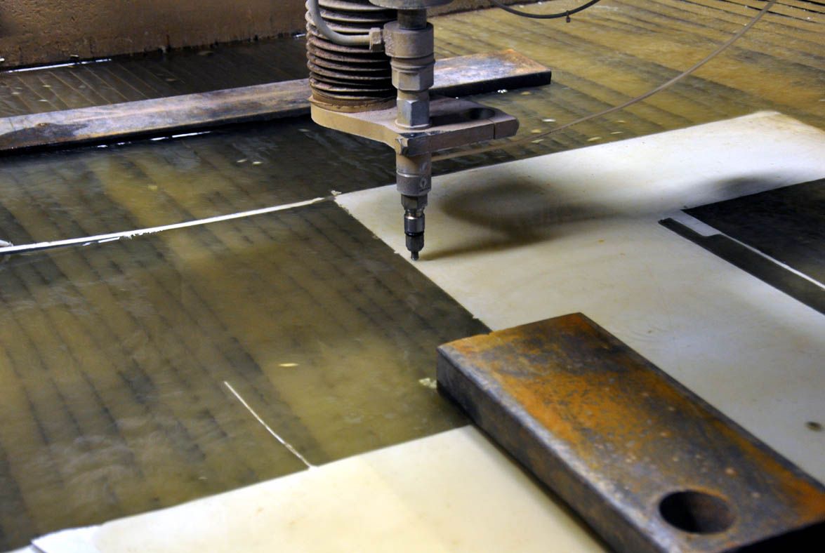 The cutting crew input our CAD drawings into the machine’s computer and got to work quickly. The machine’s surface is actually flooded, and the material is under water when it’s cut. Since there is no “force,” the material is held in place usually just by gravity on the supporting bars you see in the photo. The work isn’t over when the water is drained, however. All the bridges that connect the parts to the larger plates need to be drilled out. The tabs left behind are then sanded or filed off.