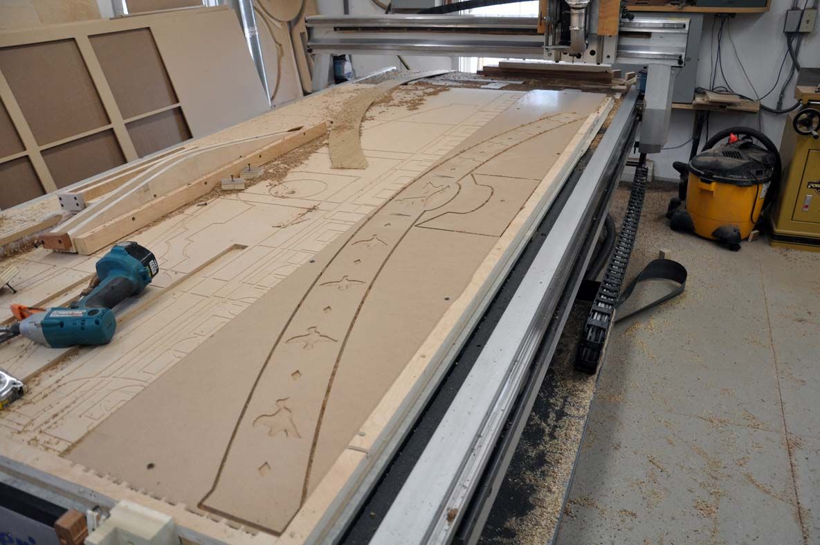[[[PAGE]]]We began the inlay process by laying out the art in CAD, and emailing it to A.L. Melanson for cutting on an enormous water jet machine. Interestingly, this machinery was first explored as a possible anti-tank weapon–water jets are capable of cutting through materials over eighteen inches thick–but their short range and the advent of newer, high-tech armors lead to the research being discontinued.