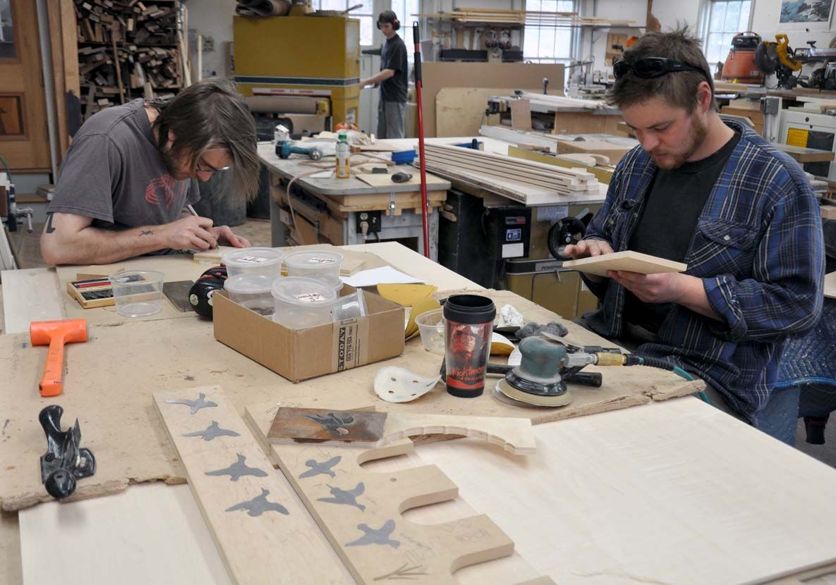 Next, each individual piece of inlay needs to be filed and beveled where it meets any adjoining piece. The material was all the same thickness, but it was ground and sculpted in a sample MDF pocket with a dynabrade, which eliminated steps where the pieces meet. One of the interesting tricks we employed here was the use of thinner material for parts like beaks, wings and feet. The thinner profile creates the illusion of depth. And finally, once all the inlays were sculpted and patinated, they were glued into the headboard using Loctite 5-minute epoxy.