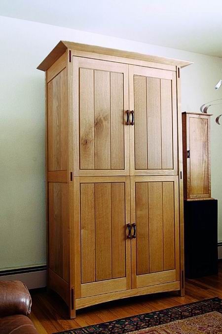 This was my first big project, an entertainment center built somewhat in the Arts & Craft style. It’s got a lot of storage, but the shape is not suitable for the newer wide-screen TVs. Dimensions: 24 in. deep by 44 in. wide by 78 in. tall.