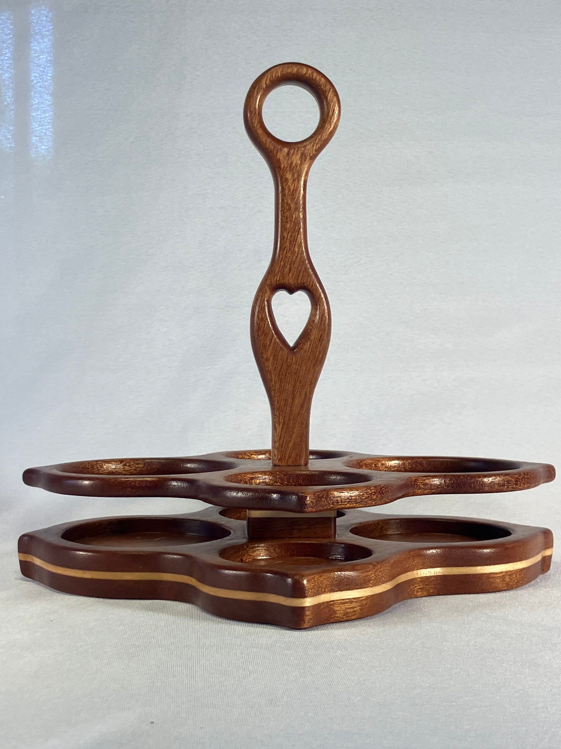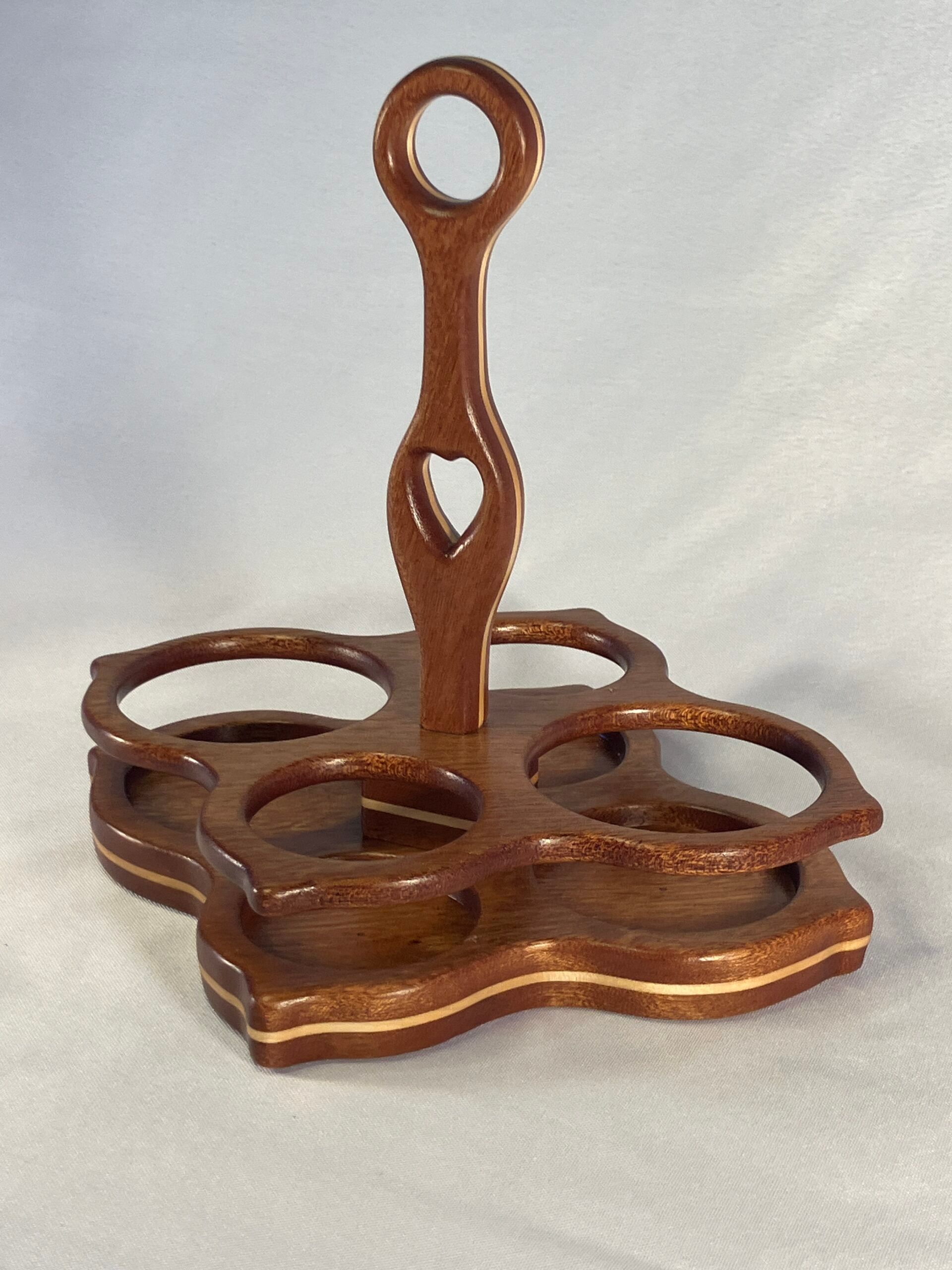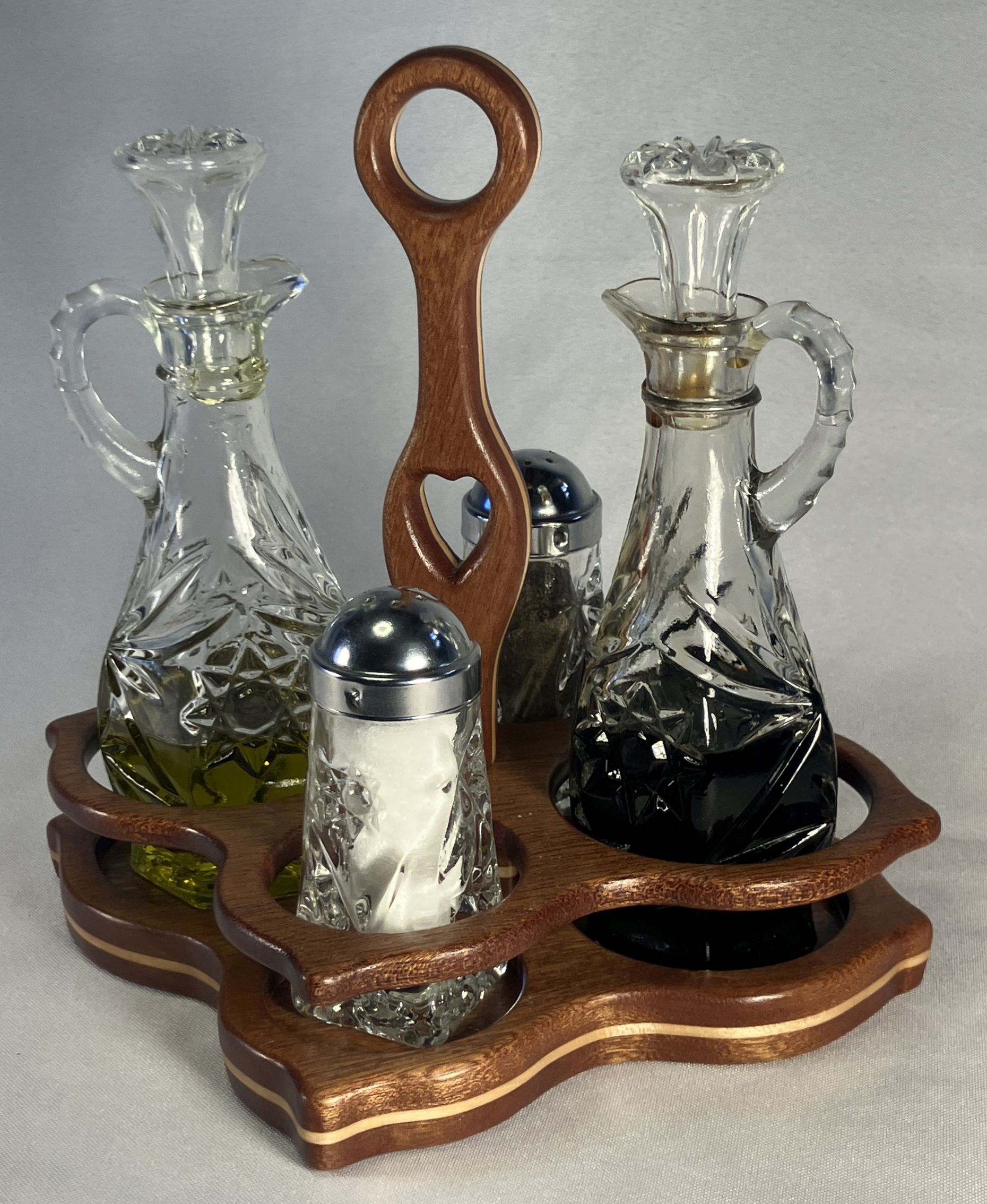European dining tables typically organize their oil & vinegar cruets and salt & pepper shakers on a small caddy that can be picked up and passed around with one finger. I made this one as a gift for my wife out of mahogany and maple to fit the glassware we already had. My goal was to make a cruet caddy that was both functional and beautiful. For function, it had to be lightweight, balanced, and easy to pick up. For beauty, I used mahogany for its rich depth of finish, and added a maple lamination for contrast. I designed the handle with a large sturdy finger hole, and added the heart cutout as a sign of affection for my wife. The result almost suggests a modern art version of a person. Simply gluing the handle to the base would not have been strong enough, so I bored the base and handle for a quarter-inch dowel before glue-up to strengthen that connection.