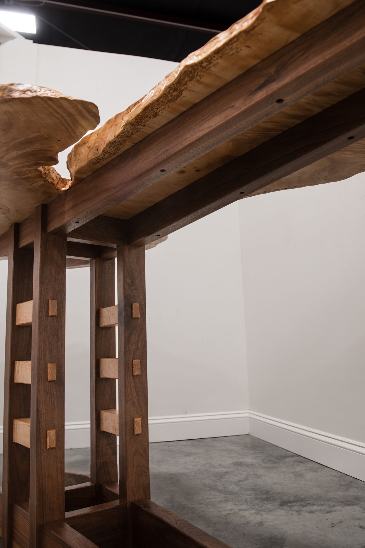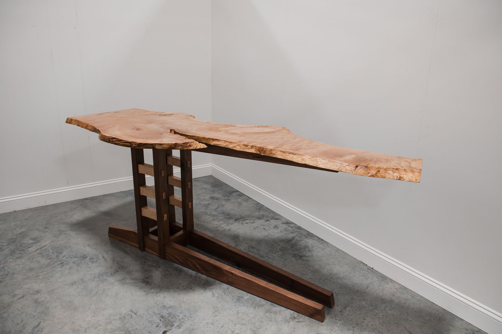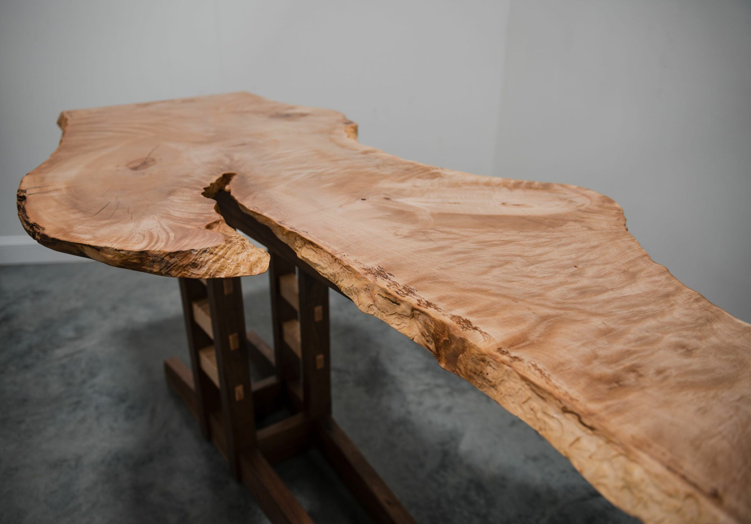 With age my beauty as an English Sycamore tree with curls and swirls has become a pleasure to look at. Black Walnut and Curly Maple rails lift me 36″ off the floor.