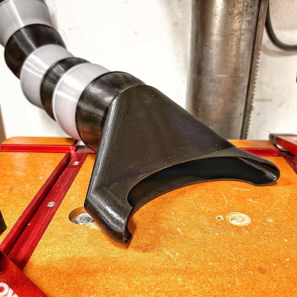 Speaking of Marius, he created a large “Loc-Line” style segmented ducting that can move any which way and stay where you put it. I have purchased a 2 1/2-inch version from Loc-Line but found that the large inlet funnel sent by Loc-Line and in Marius’s video is not ideal for most uses since it doesn’t focus the suction where you need it. Thingiverse user, Lazershrimp created this flat funnel version that is very intriguing.