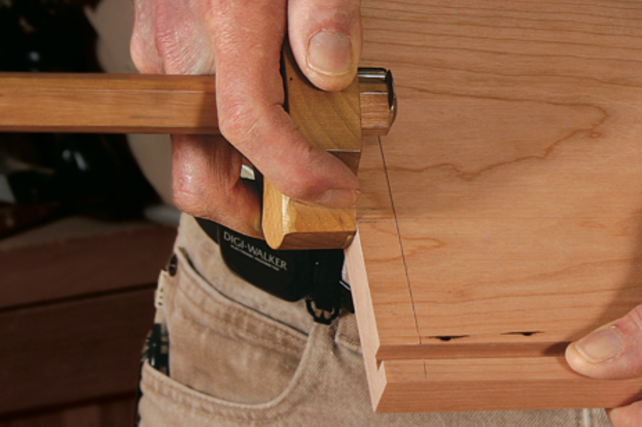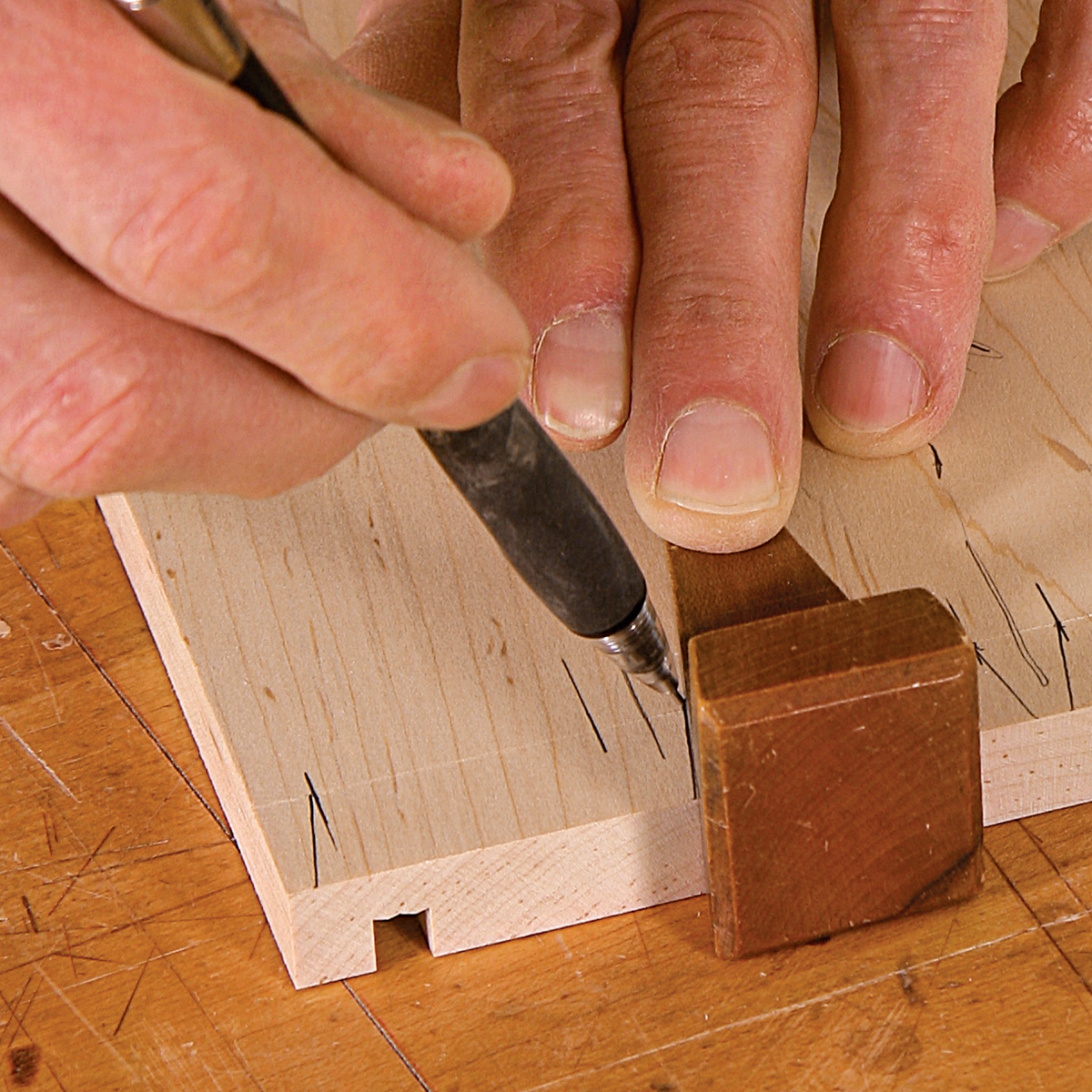 Now reset the gauge to the thickness of the sides and scribe a line on each end of the drawer front on the inside face. When I set the gauge for this line I let the cutter just overhang the side; that way, the pins will be slightly longer than the side is thick and they’ll be easy to plane or sand flush after assembly.