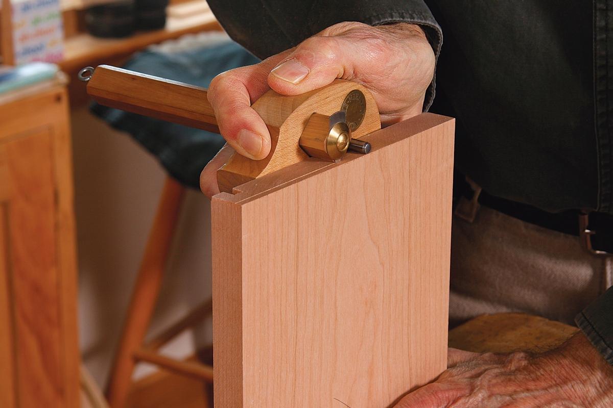 Before you begin laying out the dovetails, cut the groove for the drawer bottom in the drawer front and sides. Because the ends of the tails will not be visible once the joint is assembled, the grooves in the drawer sides, like the one in the drawer front, can be cut all the way through.