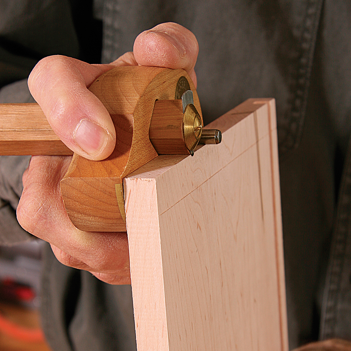 Place the marking gauge fence against the inside face of the drawer front and set the cutter by eye to leave a 1⁄8-in. lap. Mark both ends of the drawer front. Leave the gauge at that same setting to mark the drawer sides. Run the gauge’s fence along the front edge of each drawer side, marking both the inside and outside faces.