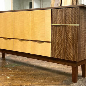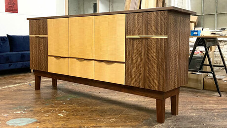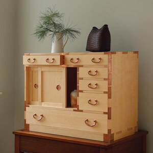 I teach quite a bit and this wall cabinet is probably one of my favorite things to teach. It’s not that big of a piece, but it packs in a ton of woodworking information. There’s dovetailed case construction, through mortise-and-tenon joinery, a traditional dovetailed drawer, and a frame-and-panel door. Between all those things, that’s 90 percent of the things that you need to know to build just about any piece of furniture. There are a lot of quiet design elements that define this piece, and one loud thing–the kumiko panel. Making kumiko is a really fun technique and it’s something I’ve been incorporating into my work for the last few years, and I still haven’t exhausted the possibilities with it. -Mike Pekovich