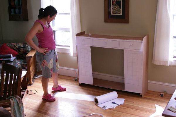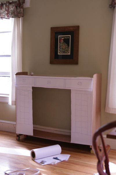 For the case I used luan plywood held together in the corners with wood blocks and hot melt glue. The doors and drawers are butcher paper taped in place. I used a marker to draw in the details. To adjust the height, I borrowed some wooden blocks from my daughter's toy box.