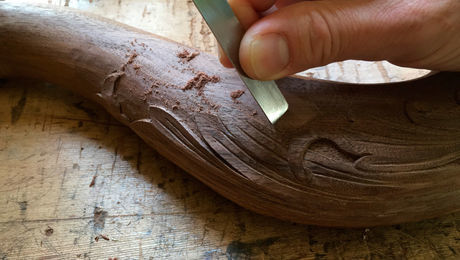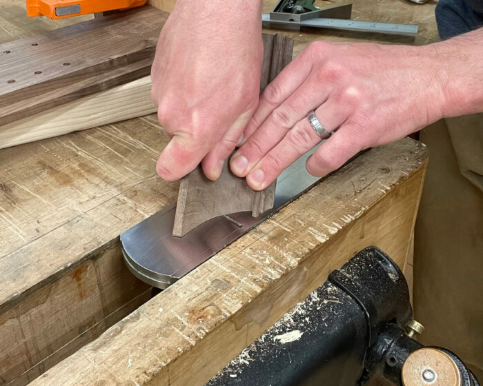 Holding the miter flat on the sole of the plane is a lot like holding the bevel against a stone in freehand sharpening, only easier because the miter is probably much wider than the bevel on your plane or chisel. If the miter’s angle is off a little, concentrate your effort and hand pressure on the high spots before working its entire length. Moving the miter diagonally across the blade can help maintain a cleaner surface while reducing the force required to pull it through the cut. This method is particularly useful for curved moldings that can be hard to hold in typical bench fixtures.