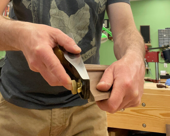 | “While holding the plane in one hand and the workpiece in the other, register the sawn miter flat on the plane’s sole just ahead of the blade and slowly draw the miter over the blade, taking care to maintain a consistent angle.” |