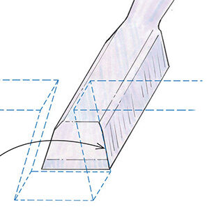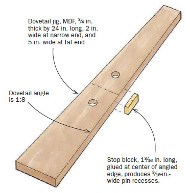 I like a 1:8 slope for my dovetails, so that’s how I angled the long edge of the jig. And I like my pins 3⁄16 in. wide at their narrow end, so the length of my stop block is 13⁄16 in. For thinner or thicker pins, change the length of the block.
