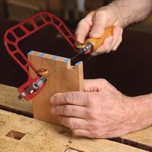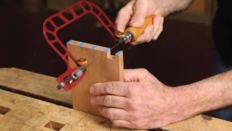 To complete the tails, I remove the waste between them with a fretsaw and pare to the baseline with a chisel. I then transfer the layout to the pins board, and cut those with hand tools.