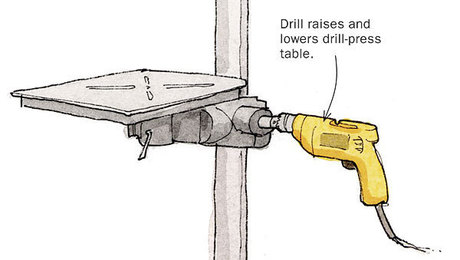 Is it so hard, though, to crank a drill press table up and down the column? My drill press table weighs a ton, especially with a large additional table on top of the drill press' own metal table, containing fence, T-track, hold-downs and the like. It takes about 30 seconds to loosen the table grip, wind it up or down by several inches then lock it again.