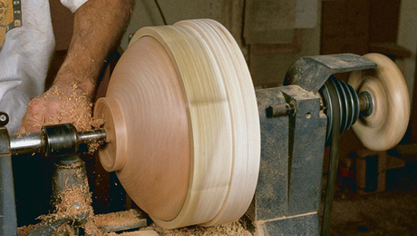 Insert the spinning top handle end first and tap it in with the butt end of your chisel. At this point, the spinning top can be shaped and decorated.