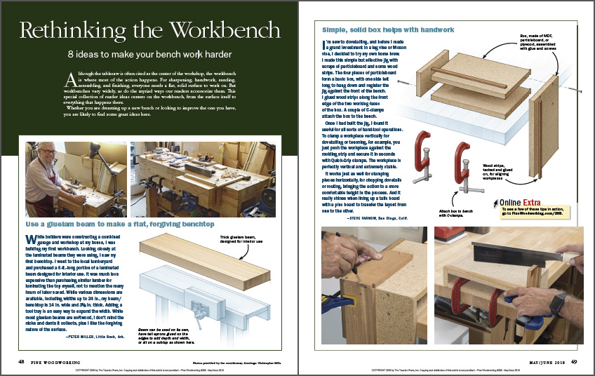 Synopsis: Used for everything from sharpening to assembly, the workbench is the heart of a woodworker’s shop. Here are a collection of reader ideas on how to make your workbench more functional, from an easy benchtop to a shopmade Moxon vise, to ingenious clamping solutions such as a carver’s clamp and some clever benchdogs.