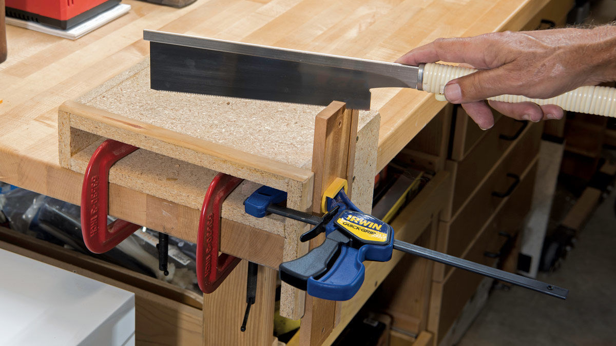 I’m new to dovetailing, and before I made a grand investment in a leg vise or Moxon vise, I decided to try my own home brew. I made this simple but effective jig with scraps of particleboard and some wood strips. The four pieces of particleboard form a basic box, with one side left long to hang down and register the jig against the front of the bench. I glued wood strips along the front edge of the two working faces of the box. A couple of C-clamps attach the box to the bench.