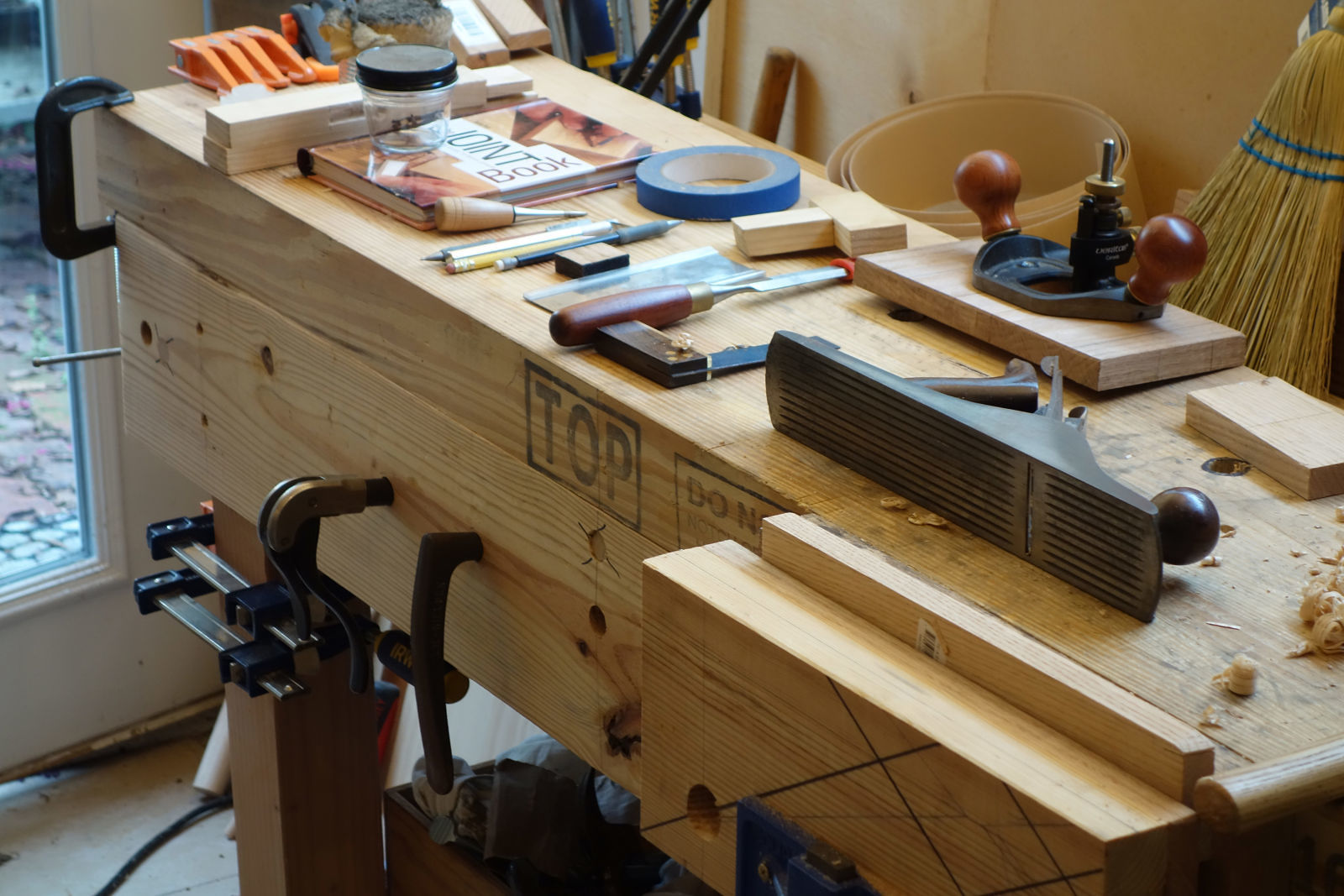 Use a gluelam beam to make a flat, forgiving benchtop: